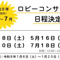 【ロビーコンサート出演者募集】令和8年4月~7月のロビーコンサートの日程が決まりました♪応募期間は、令和8年1月6日(火)~1月20日(火)です。開催日程を確認の上、ご応募ください! ★ロビーコンサート開催日程令和8年 …