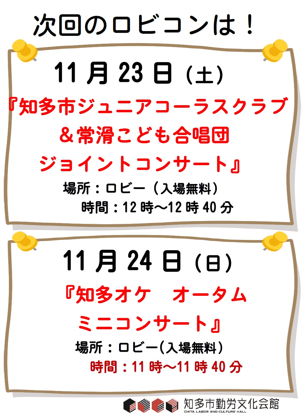 23日は、『知多市ジュニアコーラスクラブ&常滑こども合唱団ジョイントコンサート』12:00~