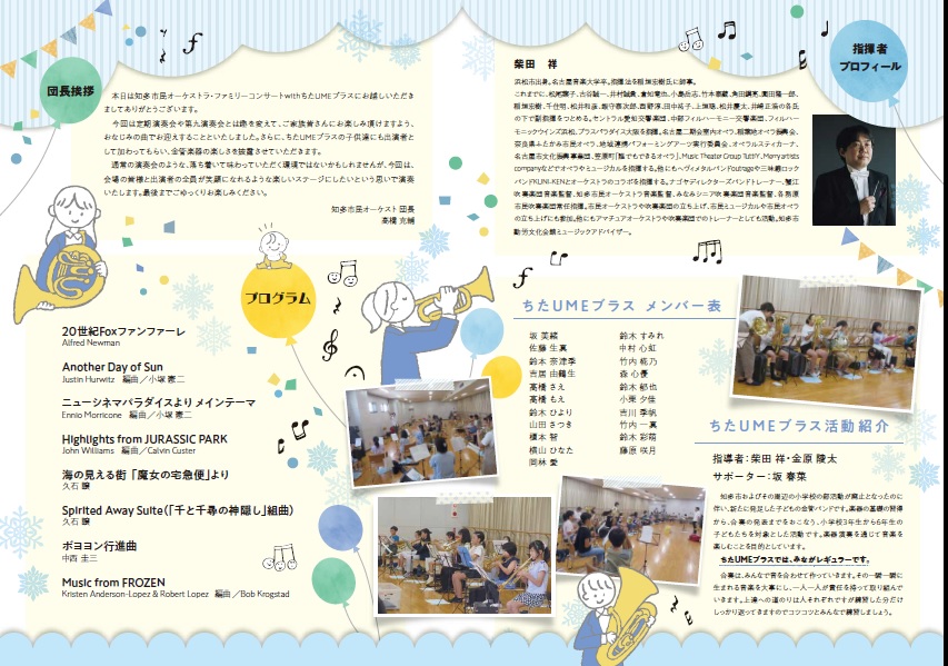 知多オケとちたUMEブラス、とっても温かいコンサートでした。子供たちも一緒に踊ったり、普段聞いたことの無い音楽についつい声を出してしまってもあまり気にせずに、みんなと一緒に楽しめました。やさしいパパと素敵なママと一緒にコンサートにお出かけするのは初めてという子供達も多かったのではないでしょうか。コンサート終了後ホールでワイワイおしゃべりできたのも楽しかったです。