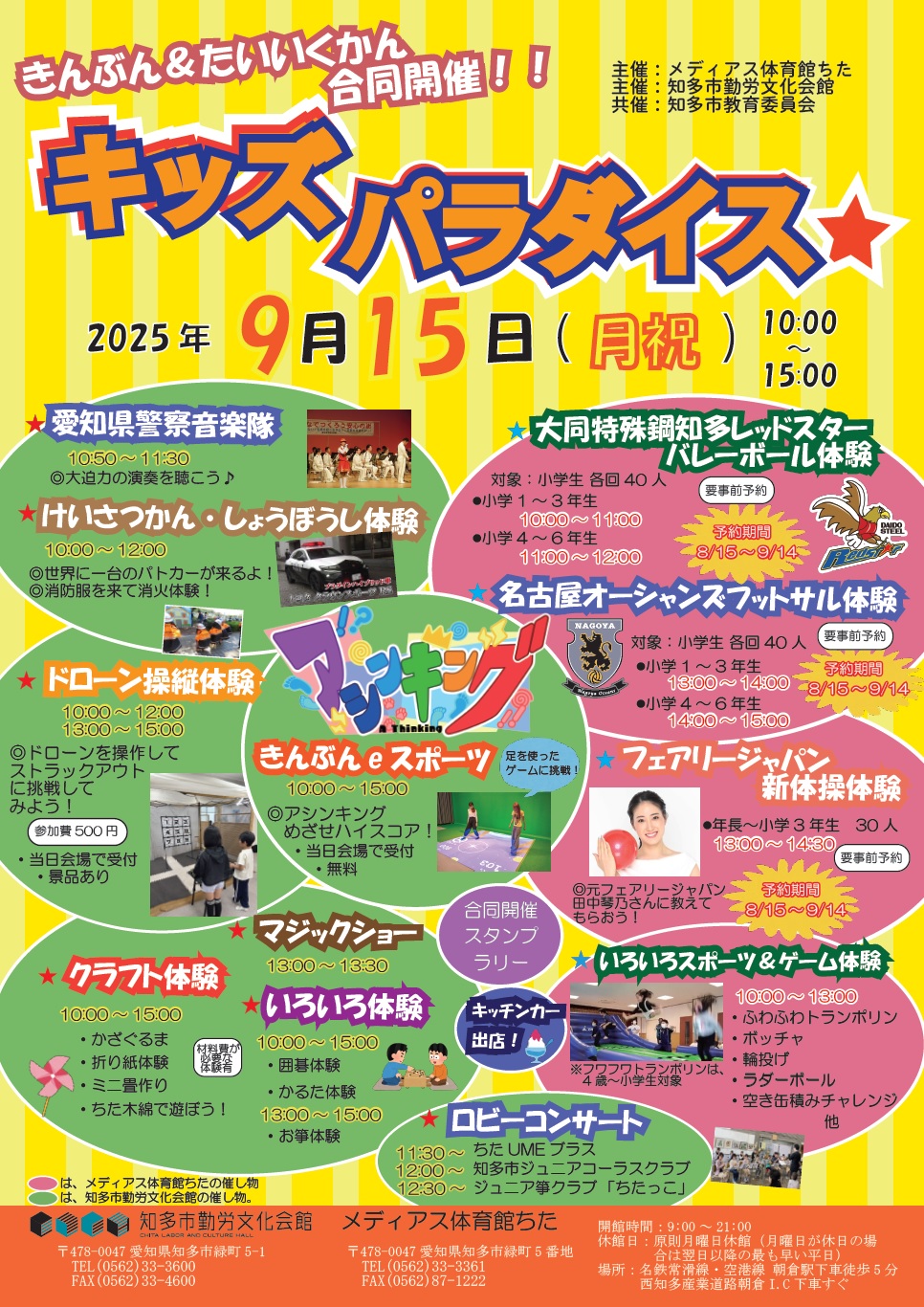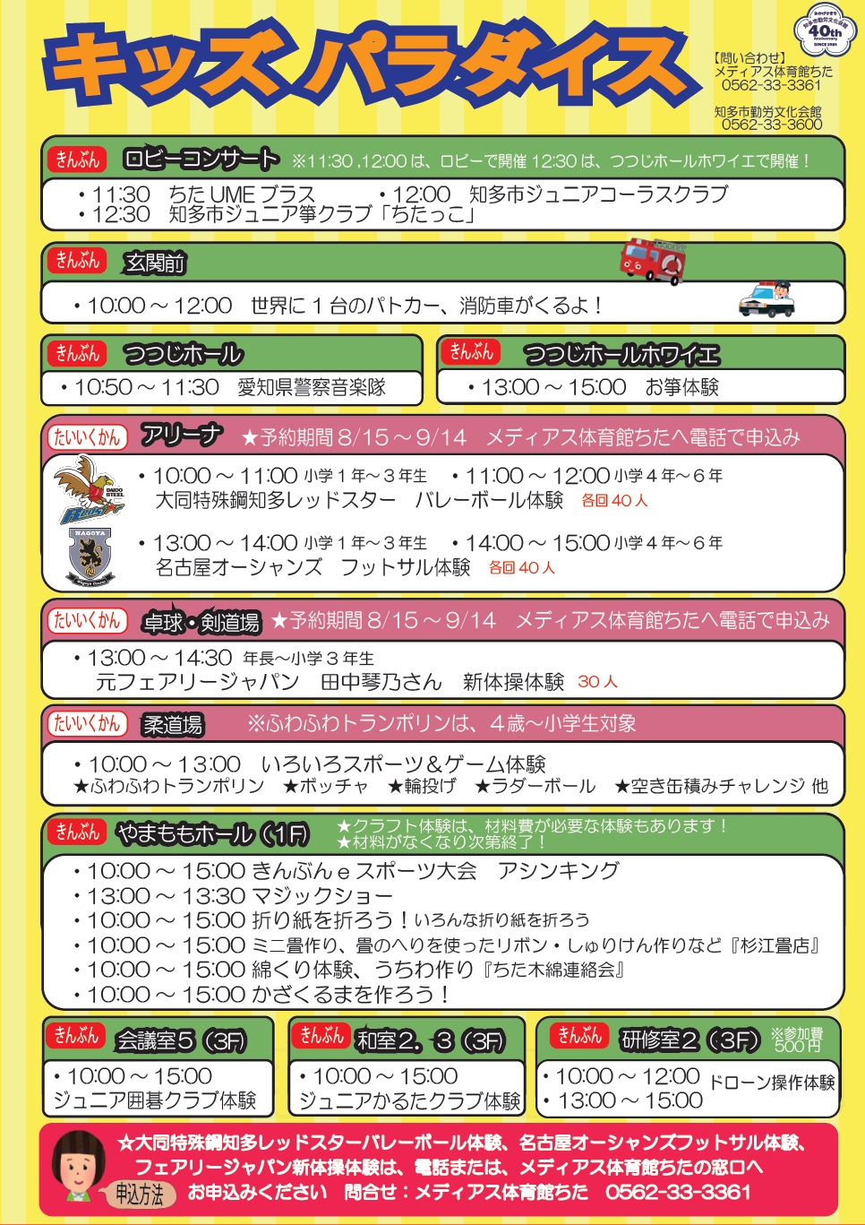 今年のキッズパラダイスは、「メディアス体育館ちた」さんと合同開催!昨年とは違った催し物がいっぱいです!みんな来てね!