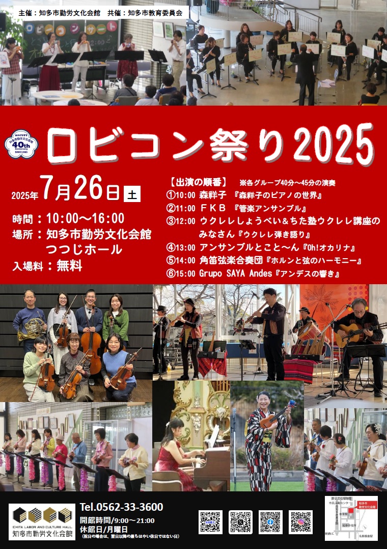 明日は、ロビコン祭り2025です! 6組のグループが10:00~各グループ40分ずつ、ピアノやウクレレ、ヴァイオリン、金管楽器、いろいろな演奏を1日中、聴けます♪