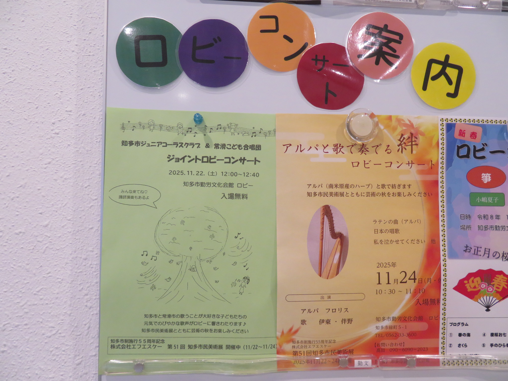今月のロビーコンサートは、11月22日(土)、23日(日)、24日(月休)の3日間連続&知多市民美術展とのコラボ企画です!★11月22日(土)12:00~知多市ジュニアコーラスクラブ&常滑こども合唱団ジョイントコンサート★11月23日(日)12:00~アンサンブル グラツィエさんによる「クラリネットとピアノで奏でる音のたより」★11月24日(月休)10:30~アルパフロリスさんによる「アルパと歌で奏でる絆」入場無料です!ぜひ聴きに来てください!