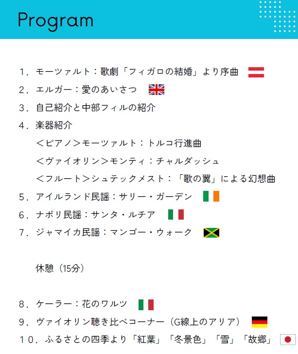 フルートの優しい音色とヴァイオリンの深い音色、ピアノ演奏で、世界の曲を楽しめました。お越しいただいたみなさんありがとうございました。