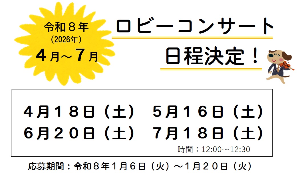 | 【概要】 | 知多市勤労文化会館では、だいたい第3土曜日(変更の場合あり)のお昼にロビーコンサートを開催しております。